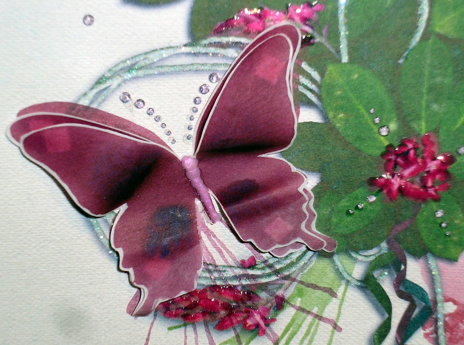 I've used glossy accents on the flowers to make them more prominent, also on the little droplets. Added glamour dust to the ribbon and twine to add a little glitz and finished off with a lovely cerise ribbon bought recently from a local bargain store. The colour of this ribbon is perfect to go with the cerise in the graphic. I triple printed the lovely deep cerise butterfly - onto printable parchment which gives a really lovely flimsy look and feel to the butterfly which unfortunately, you cannot get a good idea of from the photo.